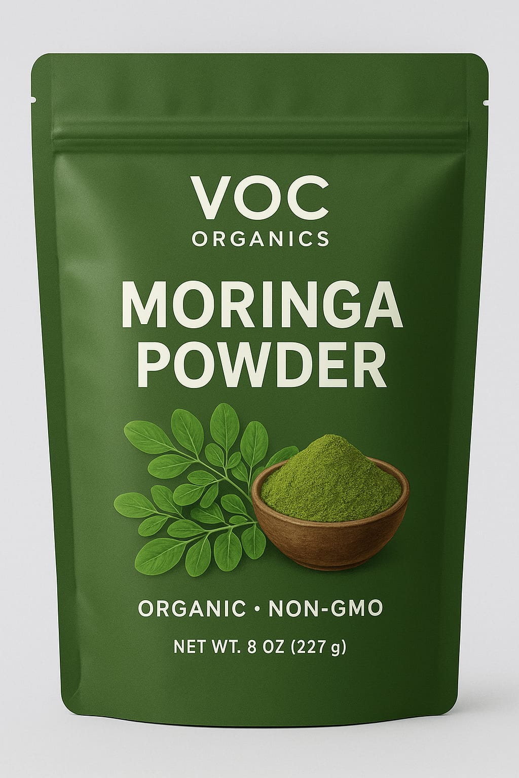 VOC Organics Moringa Powder, a nutrient-dense superfood supplement derived from the leaves of the Moringa oleifera tree, often called the “Miracle Tree.”